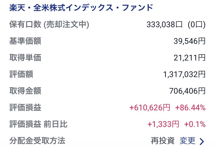 ・楽天・全米株式インデックス・ファンド(楽天VTI):1,317,032円(+610,626円)