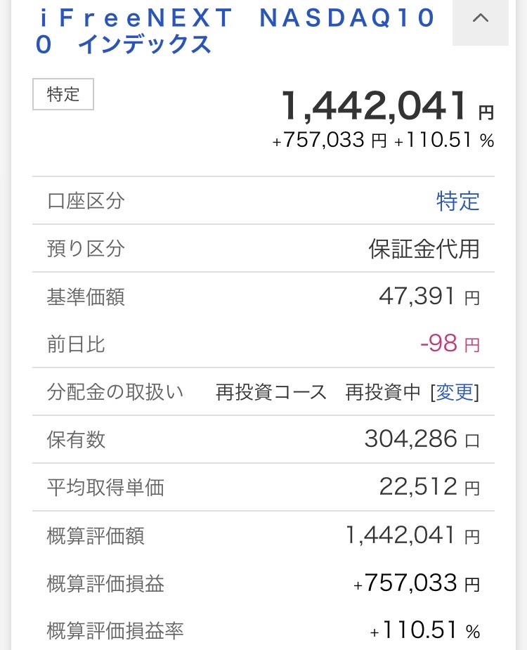 ・iFreeNEXT NASDAQ100インデックス:1,442,041円(+757,033円)
