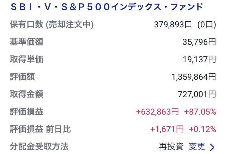 ・SBI・V・S&P500インデックス・ファンド:1,359,864円(+632,863円)