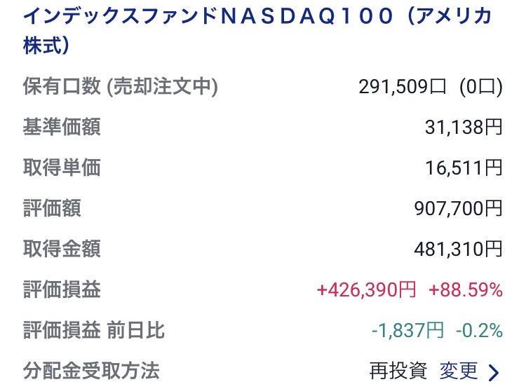 ・インデックスファンドNASDAQ100(アメリカ株式):907,700円(+426,390円)