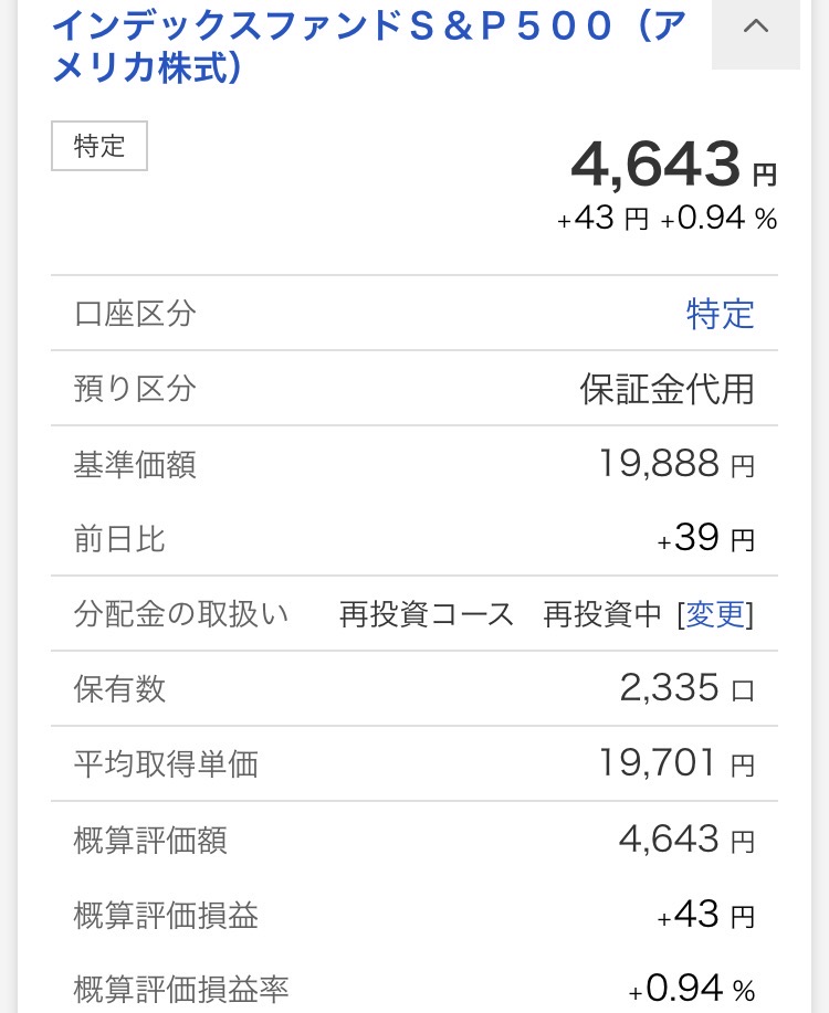 ・インデックスファンドS&P500(アメリカ株式):4,643円(+43円)