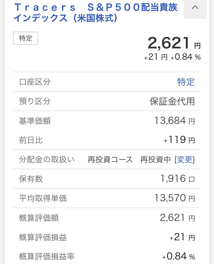 ・Tracers S&P500配当貴族インデックス(米国株式):2,621円(+21円)