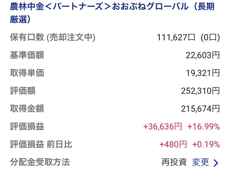 ・NVIC-農林中金<パートナーズ>おおぶねグローバル(長期厳選):252,310円(+36,636円)